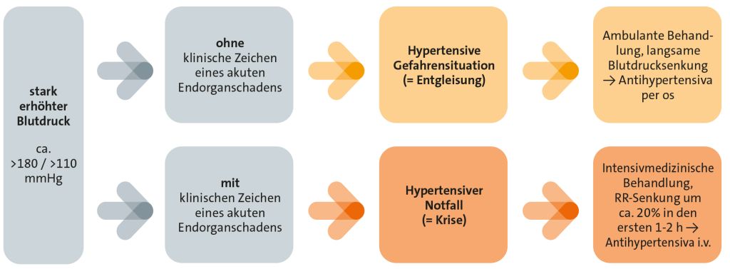 Für die Risikoabschätzung in dieser Situation ist eine Studie hilfreich, die 2016 veröffentlicht wurde. Einbezogen wurden 59.000 Patientinnen und Patienten mit einem mittleren Blutdruck von 183/96 mmHg, bei denen eine „hypertensive Gefahrensituation“ diagnostiziert wurde. Davon wurden 99,3 % (n = 58.000) ambulant behandelt und 0,7 % (n = 426) stationär aufgenommen. Bei einer sehr geringen Anzahl der stationär aufgenommenen Patienten (n = 8) stellte sich eine Endorganschädigung heraus. Während einer Nachbeobachtungszeit von sechs Monaten ergab sich kein Unterschied zwischen den ambulant und den stationär behandelten Gruppen hinsichtlich der Endpunkte kardiovaskuläre Ereignisse, Grad der Blutdruck-Kontrolle oder Krankenhausaufnahmen. (Patel et al. in JAMA Intern Med 2016 doi:10.1001/jamainternmed.2016.1509)