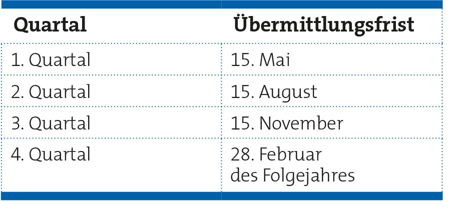 Wir empfehlen Ihnen, die Übermittlung der Exportdatei direkt nach Abschluss Ihrer Quartalsabrechnung vorzunehmen. Sofern Sie dies nicht im Verbund erledigen, müssen für die jeweiligen Quartale jedoch gewisse Fristen zur Übermittlung der Dokumentationen beachtet werden (s. Tabelle).