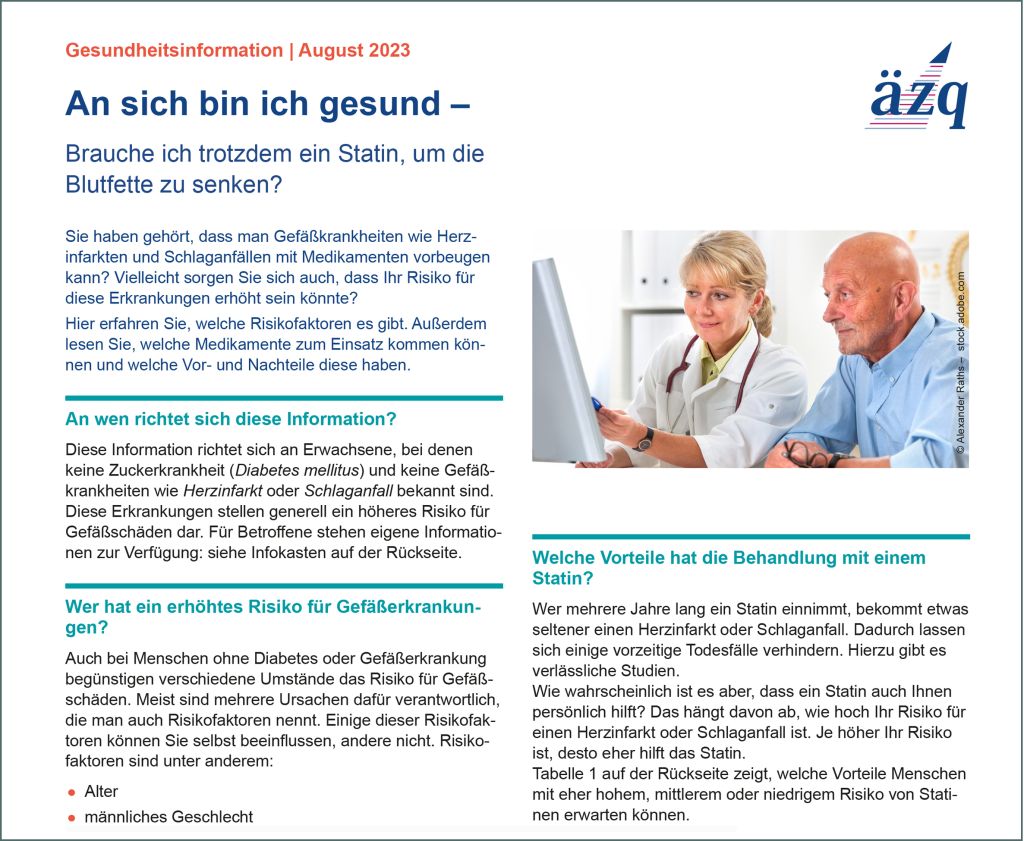 Das Ärztliche Zentrum für Qualität in der Medizin (ÄZQ) hat eine Patienteninformation zu Statinen herausgebracht. Auf zwei Seiten wird allgemein verständlich dargestellt, welche möglichen Vor- und Nachteile es hat, wenn man Medikamente zur Cholesterinsenkung (Statine) einnimmt. Ziel ist, ernsthaften Gefäßerkrankungen wie Herzinfarkt oder Schlaganfall vorzubeugen.