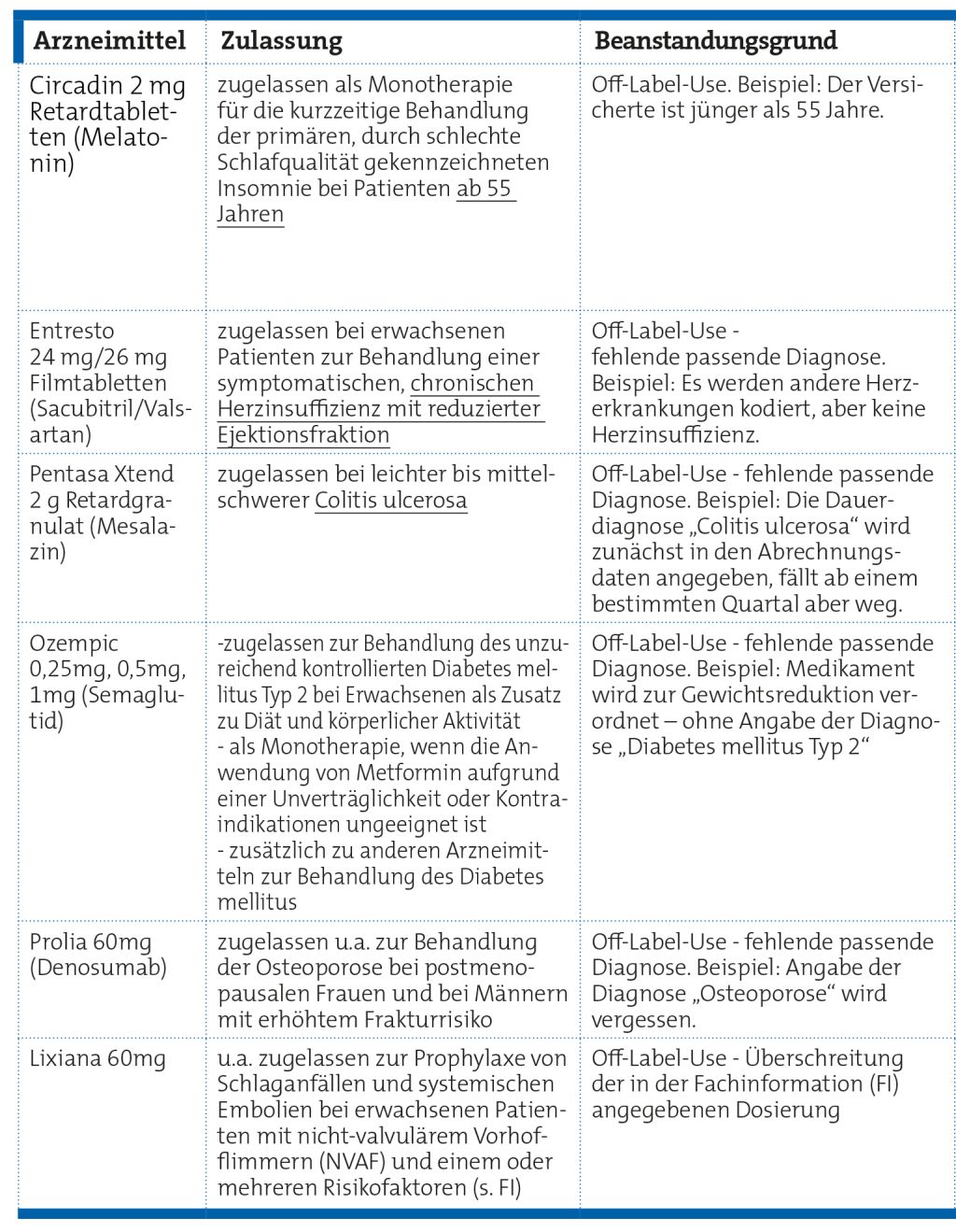 Zum Vorwurf „Off-Label-Use“ ist zu beachten: Nicht nur Diagnosen sind Teil der Zulassung, sondern auch definierte Altersgrenzen, die Dosierung, die Therapiedauer und die Art der Applikation. Die Krankenkassen reichen beispielsweise Prüfanträge ein, wenn die definierte Altersgrenze unterschritten ist. Auch bei Über- oder Unterschreiten der in der Fachinformation angegebenen Dosierung kommt es zu Prüfanträgen.