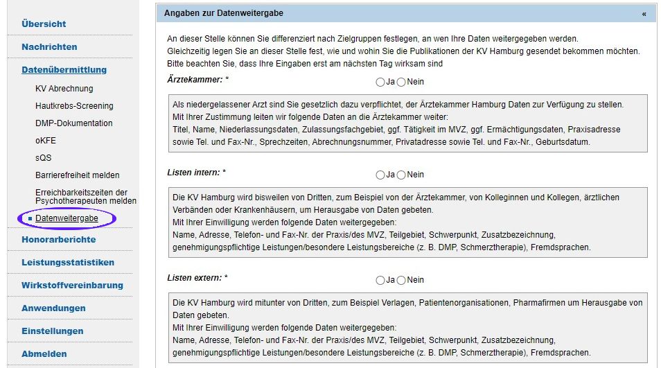 Bisher hat die KV bei der Neu-Zulassung von Ärzt:innen und Psychotherapeut:innen nach dem Einverständnis zur Datenweitergabe gefragt und die jeweiligen Wünsche im Arztregister hinterlegt. Was die Ärzt:innen und Psychotherapeut:innen zu diesem Zeitpunkt angegeben haben, konnten sie später allerdings nirgends einsehen und mussten es im Zweifel bei der KV erfragen.