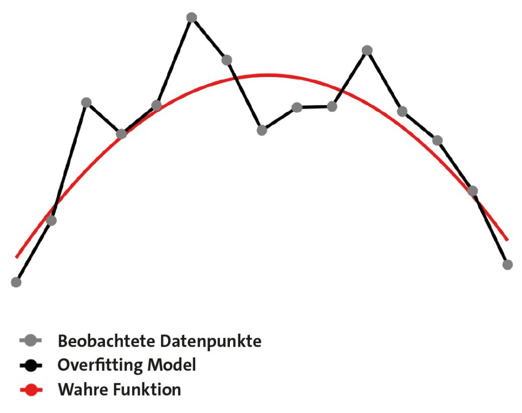 Overfitting: Overfitting, auf Deutsch ‚Überanpassung‘, bezeichnet ein Phänomen, bei dem ein Modell zu stark auf die Trainingsdaten passt. Es passt sich so sehr an die Trainingsdaten an, dass es nicht mehr auf eine externe Kohorte generalisierbar ist. Das bedeutet, dass das Modell zwar während der Trainingsphase eine gute (oder sogar hervorragende) Performance aufweisen kann, aber in der Validierung nicht mehr gut abschneidet. Somit ist es für Anwendungen in verschiedenen klinischen Situationen unbrauchbar. Overfitting kann verschiedene Gründe haben, zum Beispiel die Verwendung vieler Faktoren bei kleinen Stichproben. Es kann jedoch durch geeignete Maßnahmen erkannt und während der Modellentwicklung verhindert werden. Vorsicht ist geboten, wenn nur bestimmte Ergebnisse berichtet werden, da diese ein Overfitting verschleiern können.