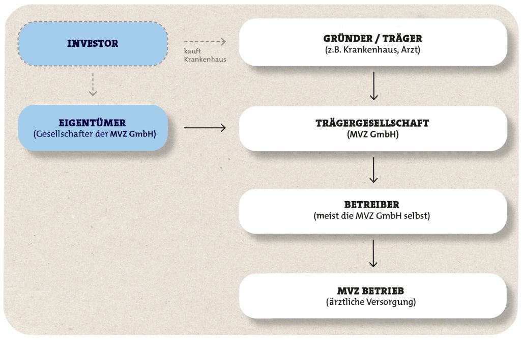 • Beispiel: Investor hält 75 % und Arzt hält 25 % der MVZ GmbH. Oder: Krankenhaus-Konzern hält 100 % der MVZ GmbH.