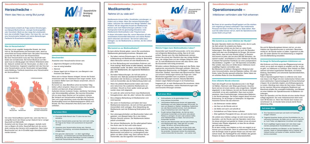 Das Ärztliche Zentrum für Qualität in der Medizin (ÄZQ) veröffentlicht Patienten-Kurzinformationen in verständlicher Sprache für verschiedene Krankheitsbilder oder Gesundheitsthemen. Ärzt:innen, Pflegekräfte und andere medizinische Fachleute können die Kurzinformationen kostenlos herunterladen, ausdrucken und an Erkrankte und Interessierte weitergeben. Grundlage dieser Infoblätter sind die jeweiligen S3-Leitlinien beziehungsweise eine systematische Literaturrecherche.