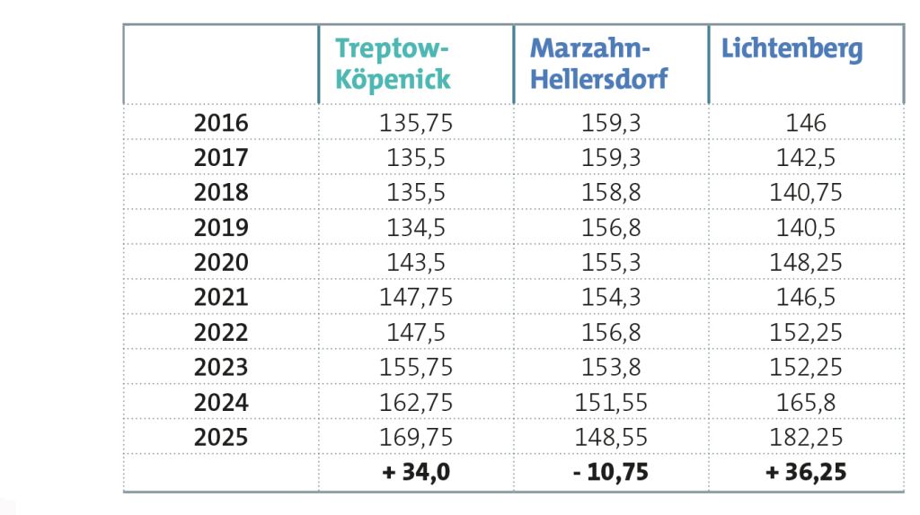ruppert: In den ohnehin schon schlechter versorgten Bezirken. Seit 2020 wuchs die Bevölkerung in Marzahn-Hellersdorf um knapp 9 Prozent, in Treptow-Köpenick um 8,5 – in Berlin insgesamt nur um 5 Prozent. Bei Kindern sind die Zahlen noch verrückter: plus 15 Prozent in Marzahn-Hellersdorf, plus 14,2 in Treptow-Köpenick.