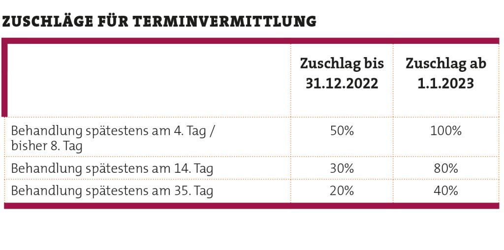 Die in der Tabelle aufgeführten Zuschläge können Fachärzte künftig auch abrechnen, wenn sie Patienten auf Vermittlung eines Hausarztes behandeln. Die Behandlung wird weiterhin extrabudgetär und damit in voller Höhe vergütet. Hausärzte erhalten für die Terminvermittlung statt zehn künftig 15 Euro.