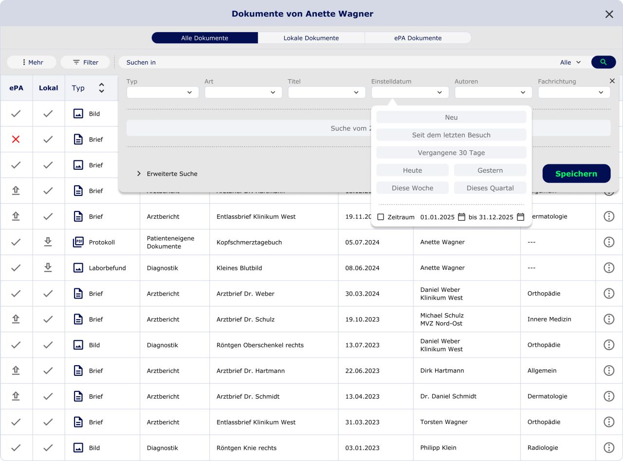 Zusätzlich sollten Filteroptionen vorhanden sein. Die Praxis kann so die Auswahl beispielsweise auf die letzten 30 Tage einschränken oder sich nur bestimmte Dokumentenarten wie Laborbefunde und Arztbriefe anzeigen lassen. Mit der Kombination aus verschiedenen Filtern und dem Sortieren können Nutzer schnell das gewünschte Dokument finden.