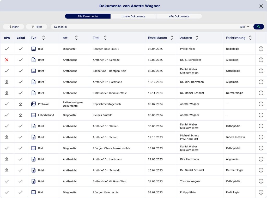 Die in der ePA gespeicherten Dokumente sollten im PVS in einer Dokumentenübersicht dargestellt sein, beispielsweise in Form einer Liste: Jeder Eintrag, bestehend aus Dokumentenname, Dokumentenart, Datum und Autor, steht in einer eigenen Zeile. Dabei sollte sofort erkennbar sein, ob in der ePA vorhandene Dokumente bereits in seiner Behandlungsdokumentation im PVS („Patientenkartei“) enthalten sind, also schon heruntergeladen wurden. Das PVS sollte dabei unterstützen, eine Doppelablage von Dokumenten zu vermeiden.