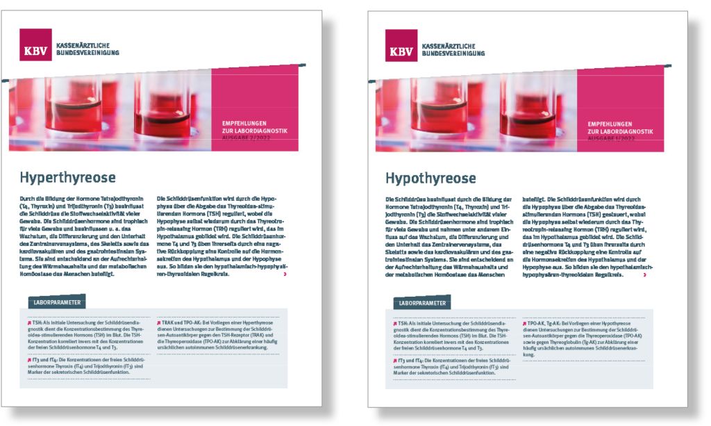Die ersten beiden Ausgaben der neuen Reihe „Empfehlungen zur Labordiagnostik“ informieren auf jeweils vier Seiten zur Labordiagnostik der Schilddrüsenerkrankungen Hyperthyreose und Hypothyreose. Neben einem übersichtlichen Ablaufschema zur Basisdiagnostik und zur weiterführenden Diagnostik erläutert ein Text das stufenweise Vorgehen im Detail. Die jeweiligen Laborparameter sind in einem farbig abgehobenen Infokasten zusammengefasst und so schnell erfassbar.