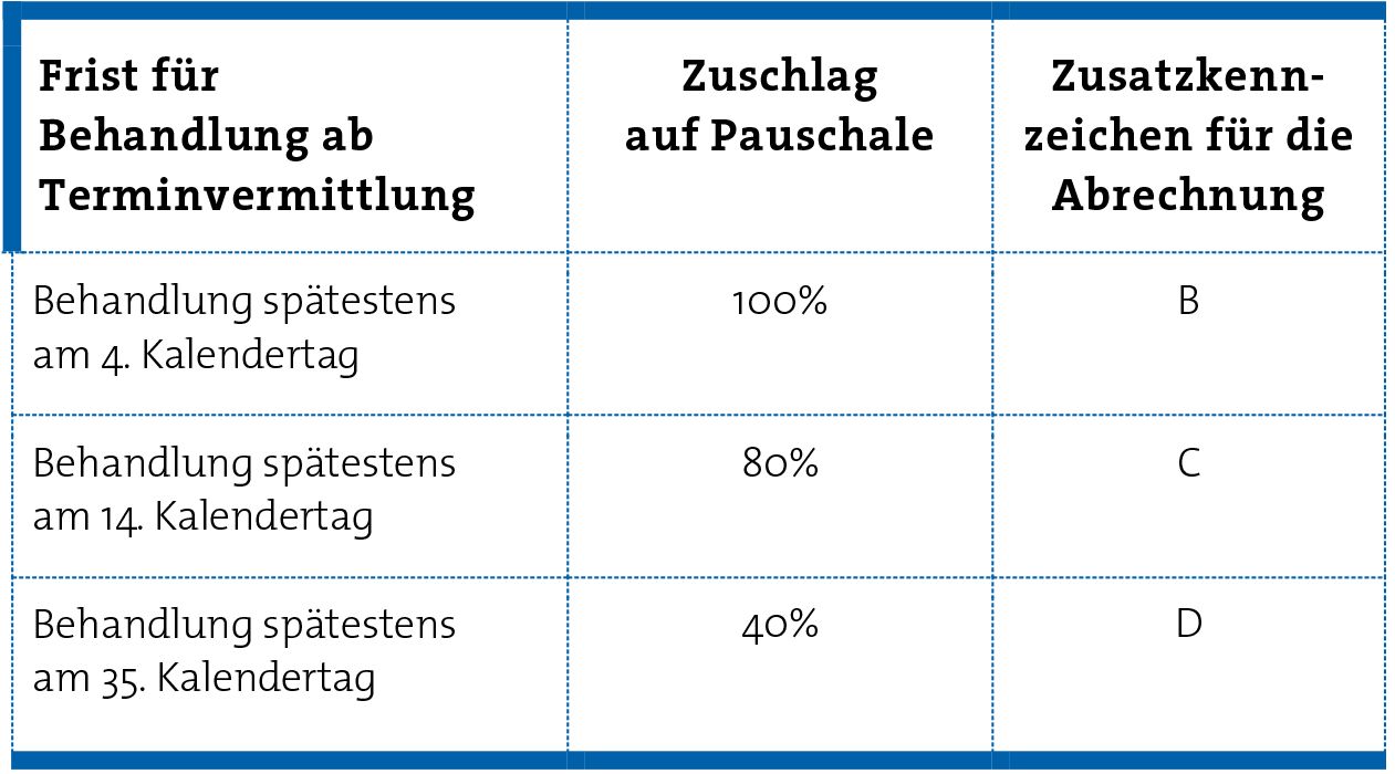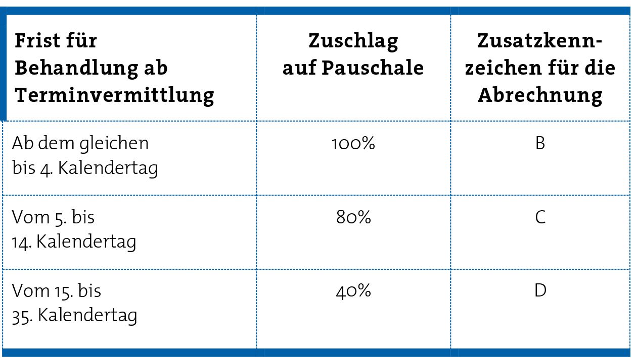 Eine Terminvermittlung ist künftig auch nach dem 4. Tag bis zum 35. Tag abrechnungsfähig. Hier ist lediglich festzustellen, dass dies aufgrund des medizinischen Einzelfalls angemessen oder anderes nicht zumutbar ist. Ab dem 24. Tag ist in der Abrechnung eine medizinische Begründung anzugeben.