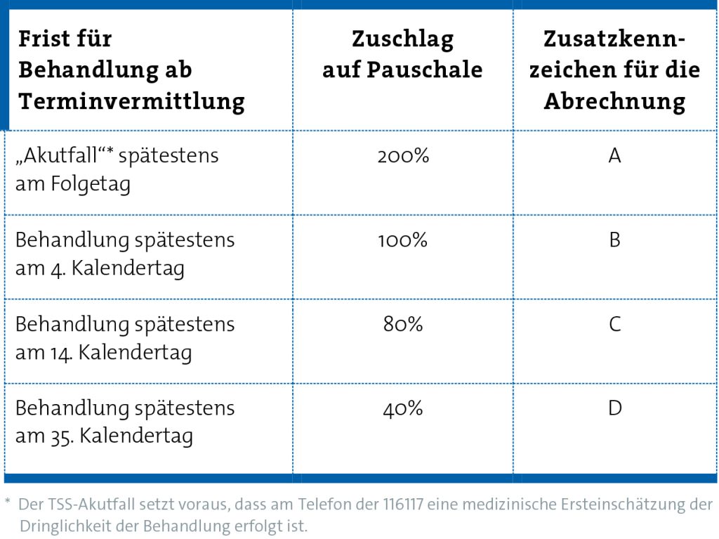Bei einer Terminvermittlung durch die Terminservicestelle (TSS) erhalten Haus- und Fachärzte sowie Psychotherapeuten die Behandlung im Arztgruppenfall weiterhin extrabudgetär vergütet. Der zusätzlich gezahlte Zuschlag zur Versicherten-, Grund- oder Konsiliarpauschale wurde deutlich angehoben.