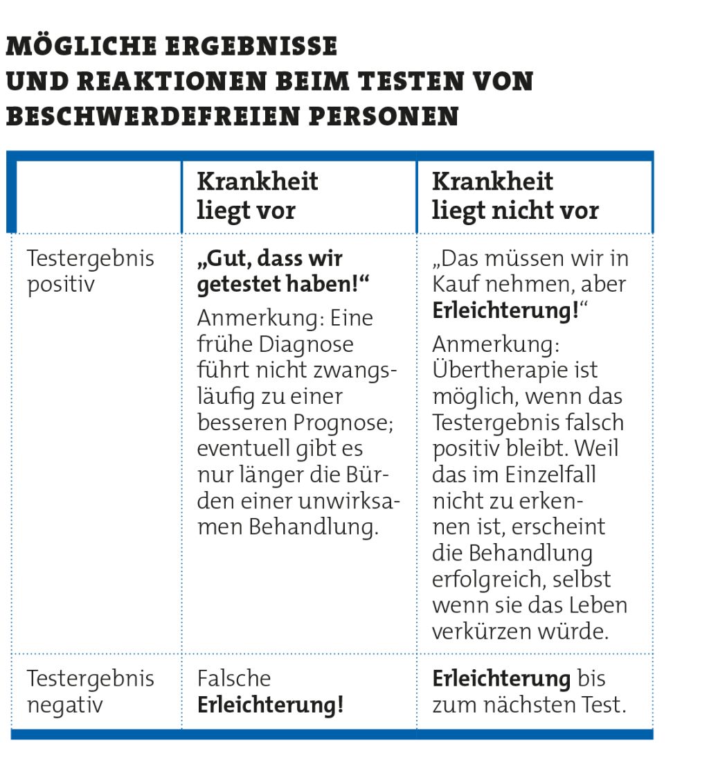 Basiskompetenzen in evidenzbasierter Medizin wären notwendig, um Sinn und Unsinn von medizinischem Testen zu verstehen. Die folgende Abbildung skizziert ein Schema zur Reflektion warum die Nutzlosigkeit oder sogar Schädlichkeit von Untersuchungen bei Personen ohne Beschwerden – anlassloses Testen – fast immer mit Zufriedenheit bzw. Erleichterung einhergeht, egal wie das Testergebnis ausfällt.