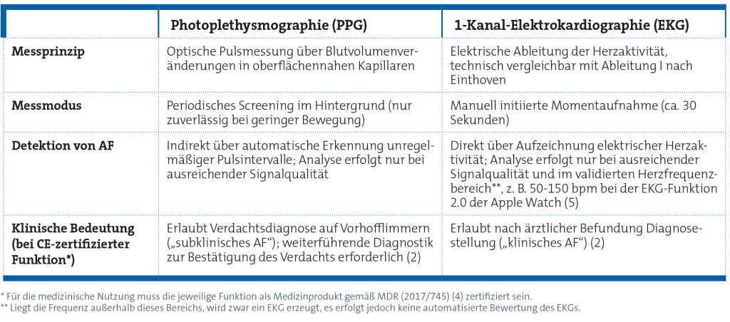 In Smartwatches können grundsätzlich zwei unterschiedliche Messverfahren zur Erkennung von Vorhofflimmern zum Einsatz kommen. Während die Photoplethysmographie (PPG) auf einer optischen Pulsmessung basiert, erfasst das 1-Kanal-Elektrokardiogramm (EKG) – technisch vergleichbar mit der Ableitung I nach Einthoven – die elektrische Aktivität des Herzens. Beide Verfahren unterscheiden sich somit deutlich hinsichtlich ihrer Funktionsweise, ihrem Messmodus und ihrer Bedeutung für die klinische Praxis (siehe Infobox 1).