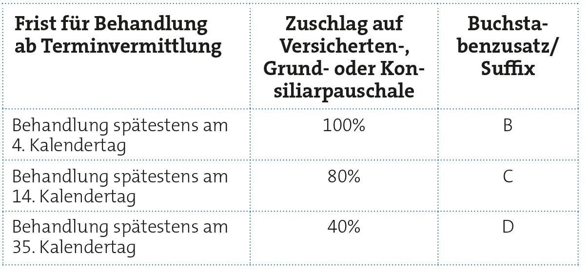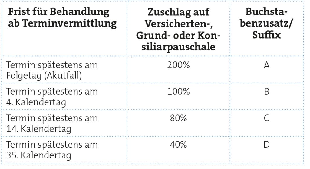 Als erstes legen Sie den Überweisungsschein im Praxisverwaltungssystem (PVS) an. Im Anschluss kennzeichnen Sie den Überweisungsschein in Ihren PVS als „HA-Vermittlungsfall“. Um den Zuschlag zur Grundpauschale zu erhalten, bringen Sie die arztgruppenspezifische GOP 08228 für Gynäkologen in Ansatz. (Jede Arztgruppe hat hierfür spezifische GOP. Es sind dieselben, die auch bei einem TSS-Terminfall benutzt werden.) Zusätzlich geben Sie hinter der GOP den jeweiligen zeitabhängigen Buchstabenzusatz (Suffix) „B, C oder D“ an (siehe Tabelle).