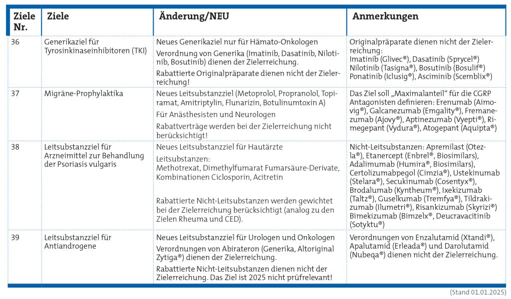 Bei einigen Zielen wurden die Zielquoten neu berechnet – entweder weil Wirkstoffgruppen um neue Wirkstoffe erweitert wurden oder weil Rabattverträge eine veränderte Bewertung ermöglichten. Wir konnten erreichen, dass die rabattierten Nicht-Leitsubstanzen in den Wirkstoffgruppen „Rheuma“, „CED“ und „Psoriasis vulgaris“ im Jahr 2025 stärker zur Zielerreichung beitragen. Ein Argument für die Anpassung war die Berücksichtigung von Rabattverträgen in Selektivverträgen vieler Ersatzkassen für Rheumatologen, Gastroenterologen und Dermatologen (z. B. RheumaOne oder DermaOne).