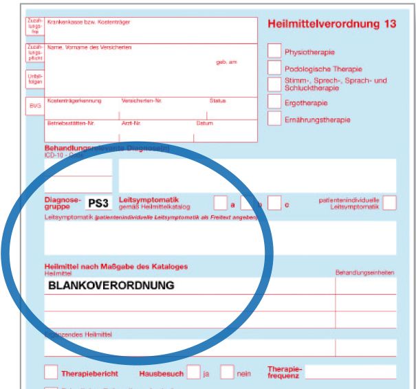 Das Verordnungsformular (Muster 13) bleibt gleich, die Verordnungssoftware fragt bei den entsprechenden Diagnosegruppen ab, ob eine Blankoverordnung ausgestellt werden soll. Wird dies bejaht, kennzeichnet die Software die Verordnung im Feld „Heilmittel nach Maßgabe des Katalogs“ als „Blankoverordnung“ (siehe Abbildung).