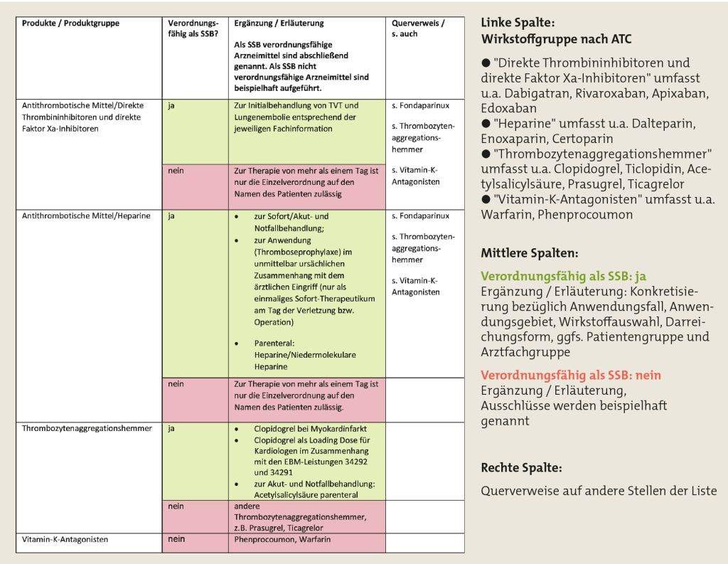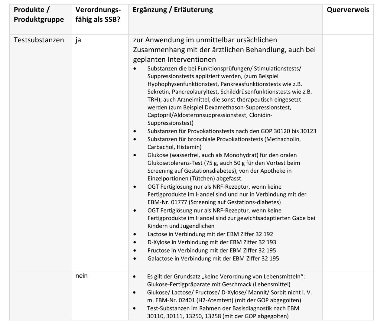 Die vier Anlagen der vorherigen SSB-Vereinbarung wurden aufgelöst und in einer Anlage zusammengeführt. Verordnungsfähige Mittel und Materialien sind mit „ja“ kennzeichnet. Materialien und Mittel, die nicht über SSB bezogen werden können, sind beispielhaft mit „nein“ gekennzeichnet aufgeführt.