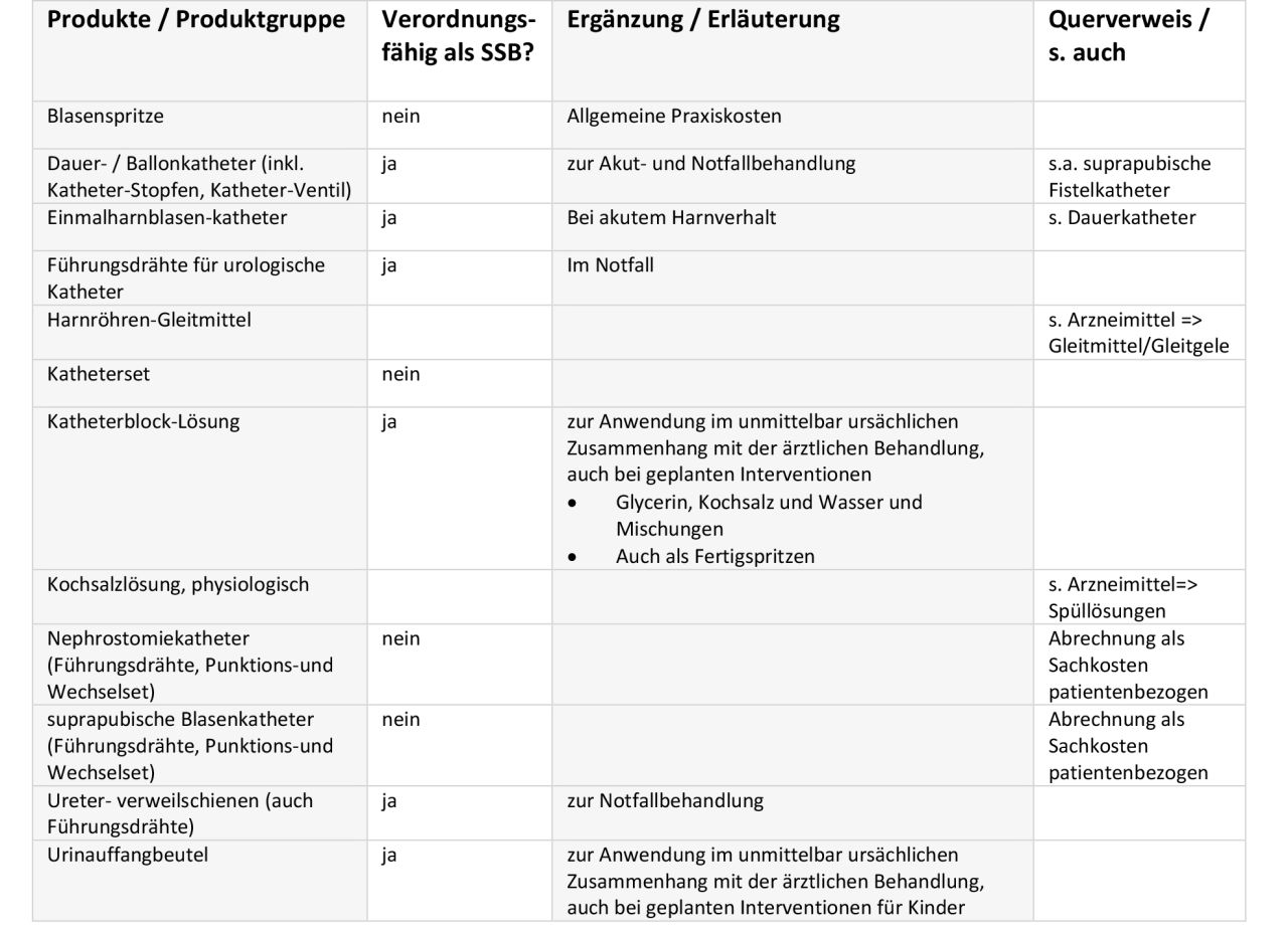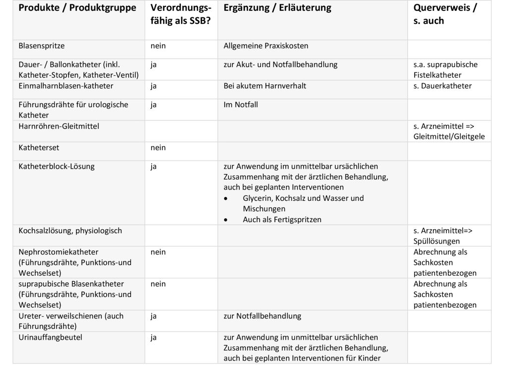 Komplett neu ist das Kapitel „Urologischer Bedarf“. Bisher waren Katheter nur über die alte Anlage 4 für den Notdienst bzw. Haus- und Heimbesuche anforderbar, Zubehör war an verschiedenen Stelle oder gar nicht als SSB aufgeführt. Mit der Neufassung finden Sie nun alle anforderbaren Produkte zusammengefasst in einem eigenen Kapitel. Auszug: