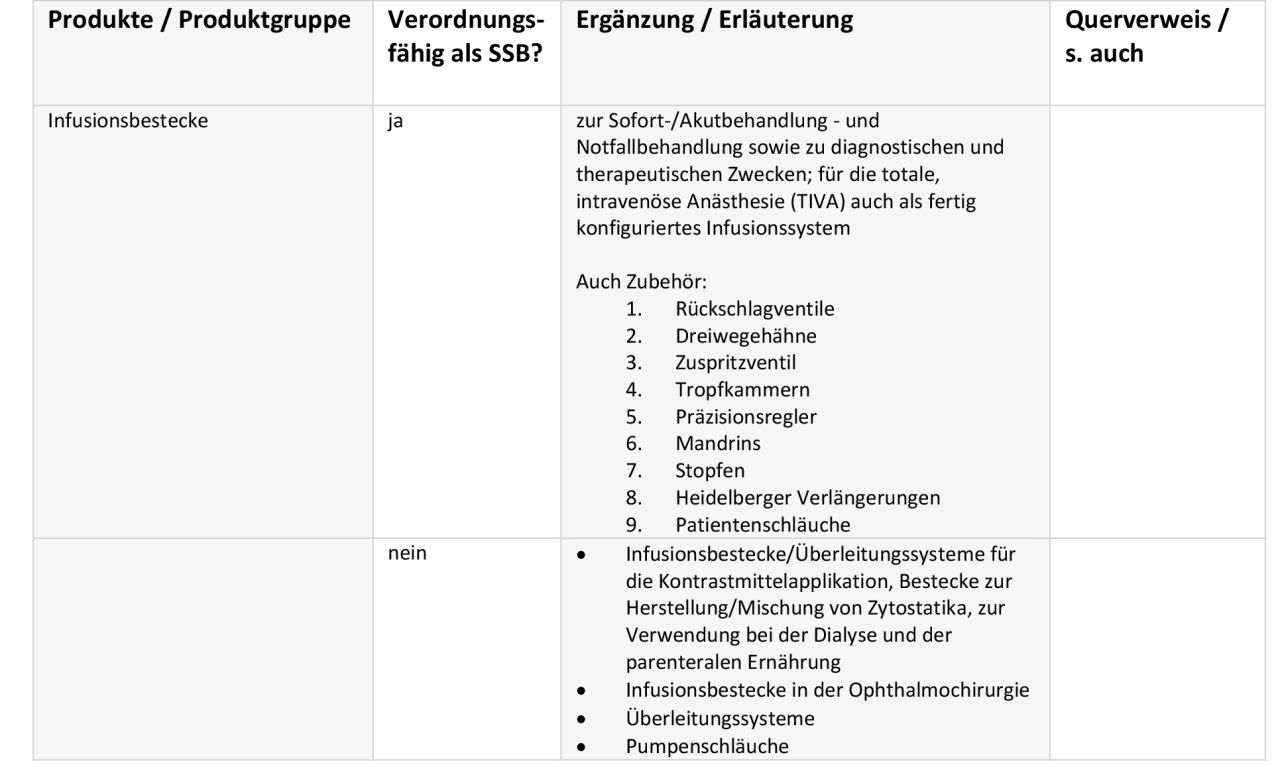 Wesentliches Ziel bei der Überarbeitung des Kapitels „Einmalbedarf zur Infusion, Injektion, Drainage, Entnahme“ war die Klarstellung, welche Infusionsbestecke und welches Infusionszubehör für welchen Anwendungsbereich angefordert werden können.