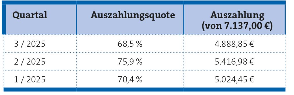 Während der vergangenen Jahre kam als weiterer Honorarkürzungsmechanismus noch die Budgetierung hinzu. In den ersten drei Quartalen des Jahres 2025 ergab das folgende Quoten und Auszahlungen: