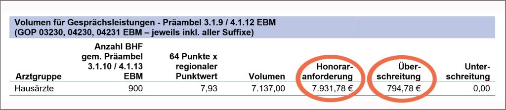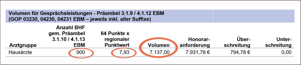 Zu 2. Nehmen wir an, eine Praxis hat 900 Behandlungsfälle. Berechnung des Volumens für Gesprächsleistungen: 7,93 € x 900 Fälle = 7.137 € Volumen