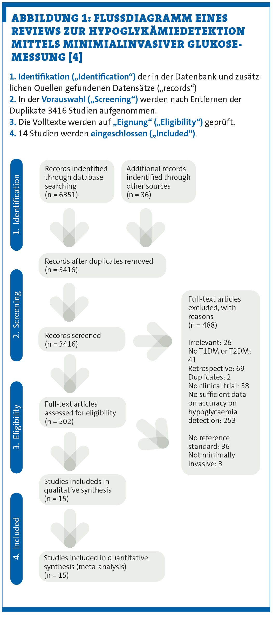 Sie könnten sich nun eine Vielzahl einzelner Studien zu dem Thema durchlesen. Dies wäre nicht nur sehr zeitintensiv, darüber hinaus könnte Ihr Blick auf die Ergebnisse verzerrt sein. Selbst wenn man Expert:in auf einem bestimmten Gebiet ist, heißt das nicht, dass man auch alle Studien kennt, die sich mit eben dieser Thematik befassen. Daher machen Sie sich auf die Suche nach einem entsprechenden Review zur Hypoglykämiedetektion mittels minimialinvasiver Glukosemessung, um Ihrem Patienten die Frage evidenzbasiert beantworten zu können – und werden fündig. Anhand der gefundenen Beispielarbeit kann man das methodische Vorgehen in einem Flussdiagramm für die verschiedenen Phasen der systematischen Übersichtsarbeit (vgl. Abbildung 1) nachvollziehen [4].