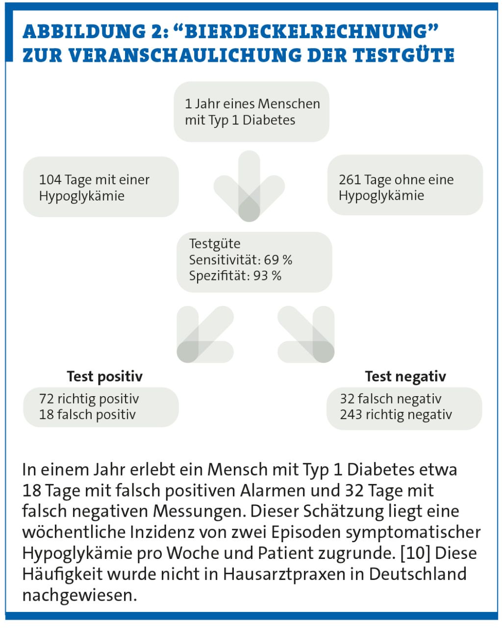 Wie sieht es nun mit der Messgenauigkeit der kontinuierlichen Glukosemessung aus? Mit der ist es leider, laut dem Ergebnis unseres Beispiels, nicht so gut bestellt. Mit einer mittleren Sensitivität von 69% werden Hypoglykämien zu häufig verpasst. Am besten lassen sich diese Ergebnisse mit einer „Bierdeckelrechnung“ veranschaulichen (Abbildung 2).