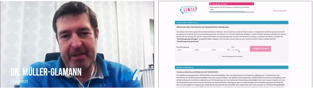 Wie können Hausärztinnen und Hausärzte innerhalb des Terminservice der 116117 unkompliziert Termine bei fachärztlichen Praxen buchen? Der Allgemeinmediziner Dr. Mike Müller-Glamann erklärt dies in einem Video im Internet. Er nutzt den eTerminservice täglich und hat den Buchungsprozess fest in seine Arbeitsabläufe integriert.