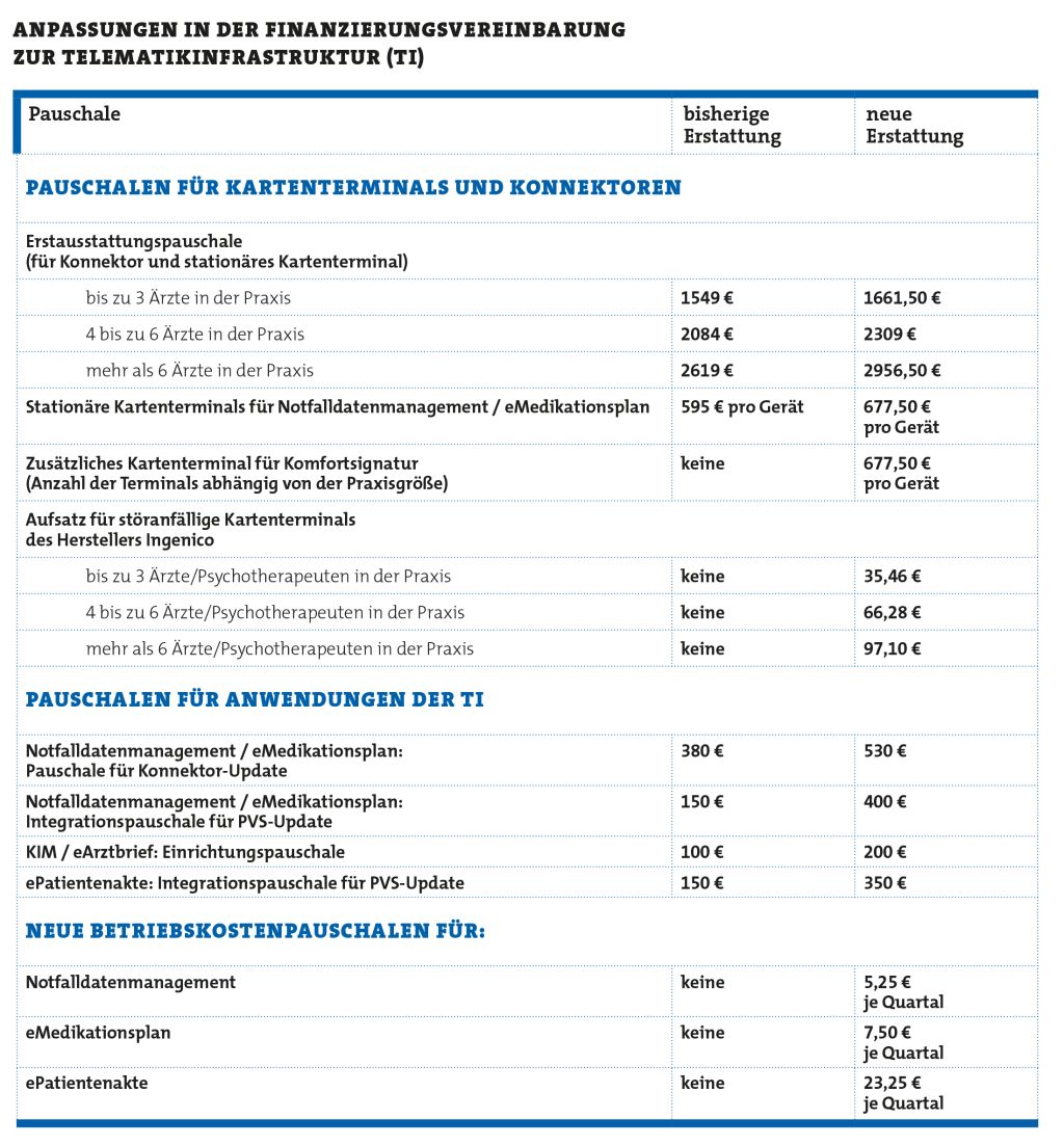 Erhöhungen wird es zudem bei verschiedenen Pauschalen für Anwendungen der Telematikinfrastruktur geben. So erhalten Praxen für die Einrichtung von KIM nun 200 Euro statt bislang 100 Euro. Der Dienst wird unter anderem für die elektronische Übermittlung von Arbeitsunfähigkeitsbescheinigungen und Arztbriefen benötigt. Auch bei den Erstattungen der Betriebskosten konnte die KBV Anpassungen für den Notfalldatensatz, den elektronischen Medikationsplan und die elektronische Patientenakte erreichen.