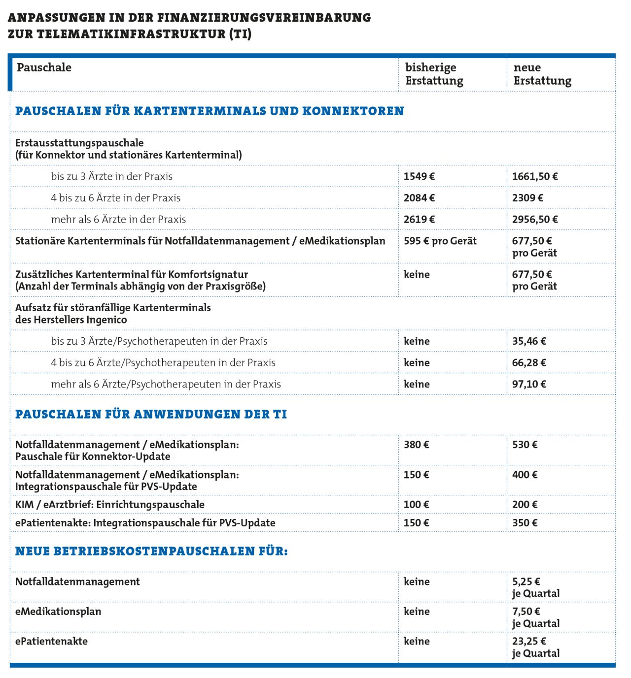 Die nun durch das Bundesschiedsamt festgelegten Eckpunkte sehen unter anderem einen höheren Erstattungsbetrag für stationäre Kartenterminals vor; statt 595 Euro erhalten Praxen nunmehr 677,50 Euro. Auch die Erstausstattungspauschalen, in denen auch die Erstattungen für die Terminals beinhaltet sind, werden angehoben.