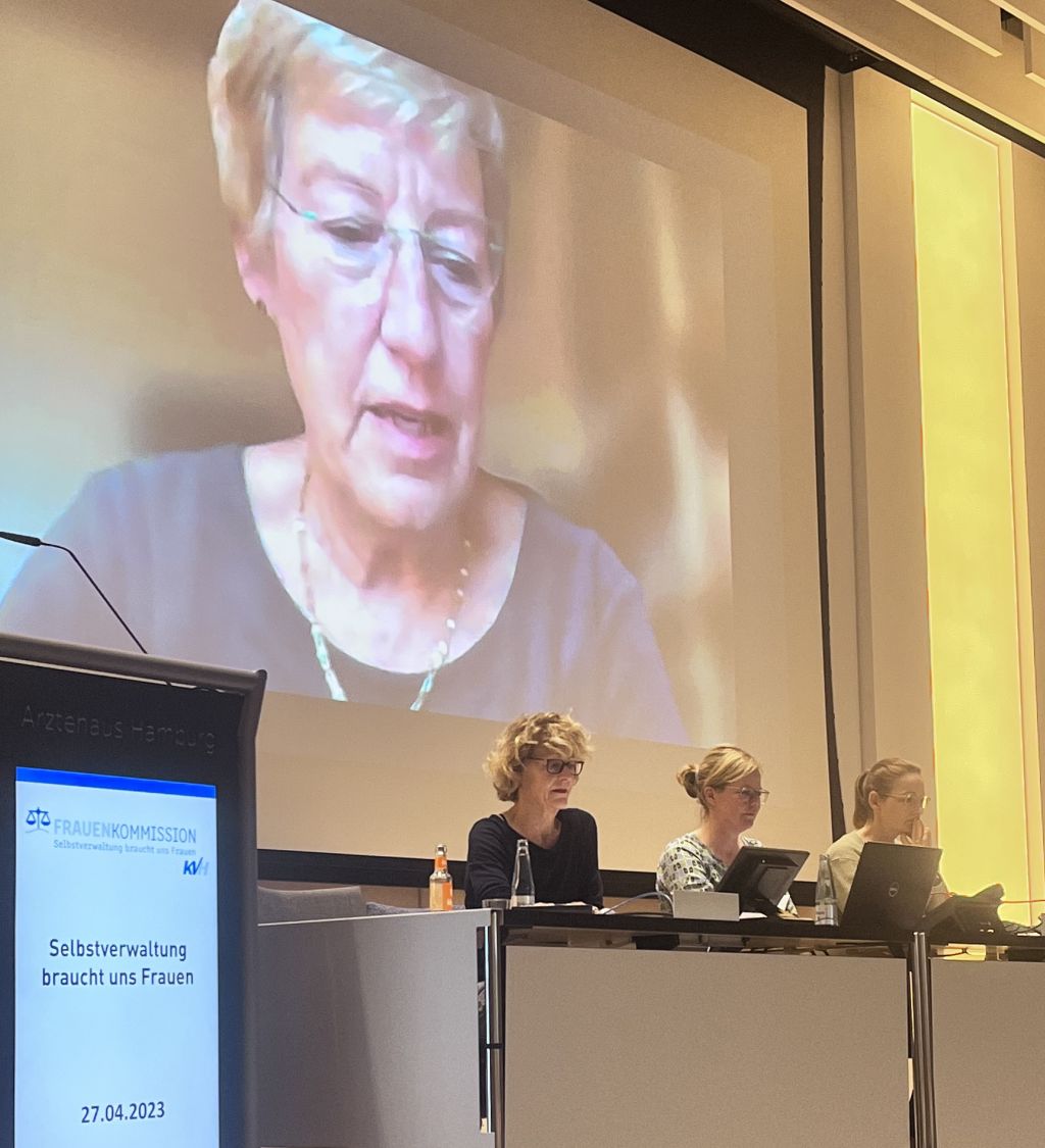 Mehrere Frauenkommissionsmitglieder gaben Einblicke in die Arbeit der KV-Gremien. Hanna Guskowski und Dr. Maria Hummes berichteten über die Entstehungsgeschichte der Frauenkommission. Dr. Claudia Haupt präsentierte Hintergründe und Abläufe, die der Gründung des Integrierten Notfallzentrums (INZ) am Marienkrankenhaus vorausgegangen sind. Und M.Sc. Marie Schwartz stellte die Arbeit des Beratenden Fachausschusses Angestellte dar.
