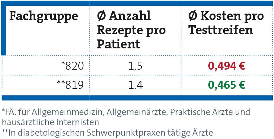 Die Ergebnisse werden für jede Fachgruppe der Honorareinheit gesondert dargestellt. Die in Rot gedruckten Durchschnittskosten pro Teststreifen liegen über den als wirtschaftlich geltenden 48,7 Cent, die in Grün gedruckten darunter.