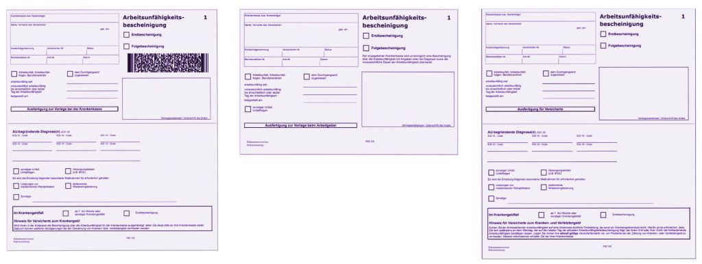 Sollte die elektronische Datenübertragung an die Krankenkassen in einer Praxis nicht funktionieren, wird ein Ersatzverfahren angewendet. In diesem Fall erhält der Patient drei Papierausdrucke – einen für die Krankenkasse, einen für den Arbeitgeber und einen für sich selbst.