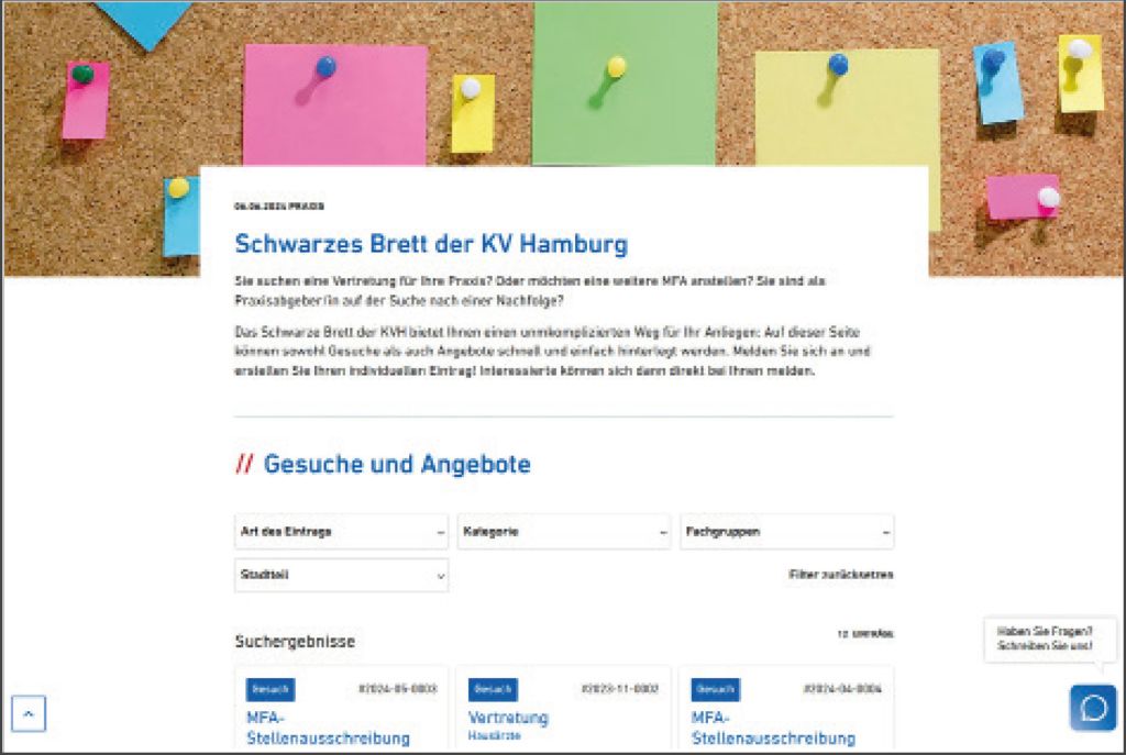 Seit Juli steht auf der KVH-Homepage unter dem Menüpunkt „Praxis“ das neue Schwarze Brett zur Verfügung. Nach einer kurzen Anmeldung können sowohl Mitglieder als auch Außenstehende ihren Eintrag hinterlegen. Dabei kann es sich sowohl um die Suche nach einer Urlaubsvertretung, einer Anstellung, einer Praxisnachfolge, einem Job-Sharing-Partner oder MFA-Personal handeln. Das Schwarze Brett ersetzt die bisherigen formalen Anforderungen für das Praxisvertretungsverzeichnis und das Interessentenverzeichnis.