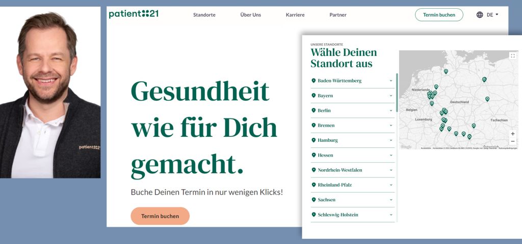 Während Doktor.de in Deutschland noch am Anfang seiner Expansionsbemühungen steht, ist die Patient21 GmbH schon einen Schritt weiter: Das Unternehmen hat die Klinik Sankt Elisabeth in Heidelberg gekauft und übernimmt derzeit in großem Stil Praxen in ganz Deutschland. Hinter Patient21 steht Christopher Muhr, der zuvor das Online-Gebrauchtwagen-Portal Auto1 geleitet hat. Er gründete Patient21 im Jahr 2019.